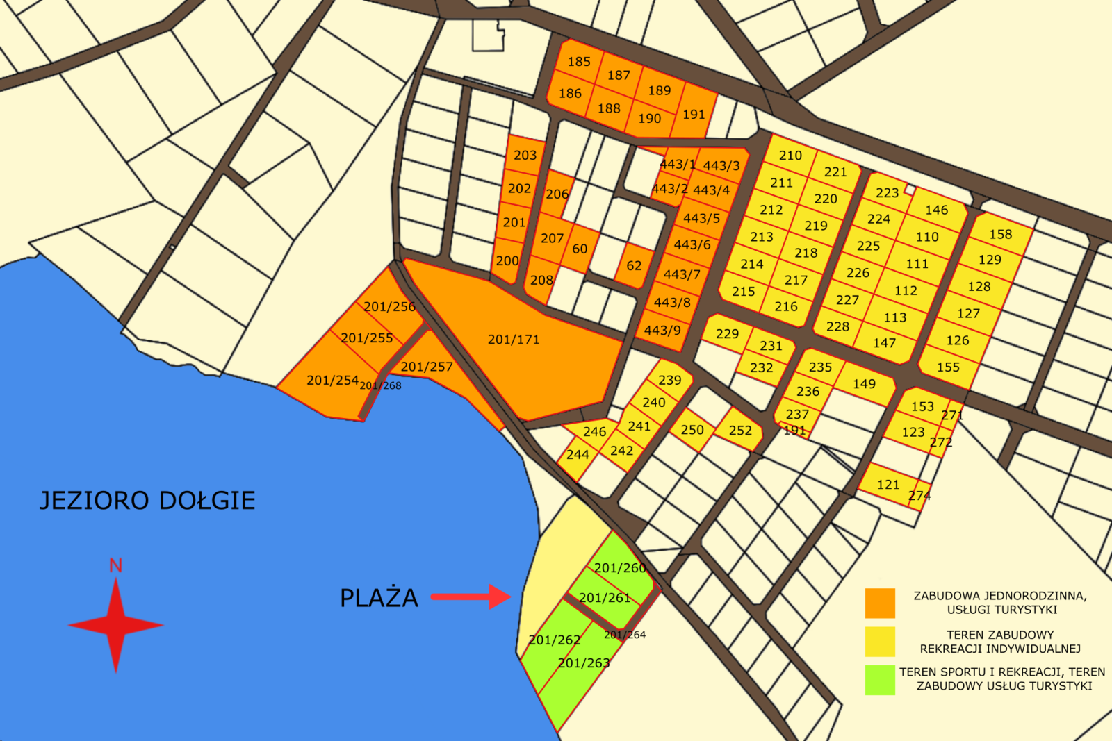Sprzedaż działek wraz z udziałem w drogach wewnętrznych o numerach 445 i 201/183 oraz z udziałem w działce nr 201/259 (plaża) o powierzchni 0,3100 ha.